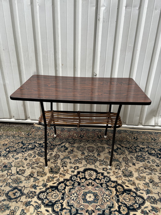 Questo tavolino vintage di metà secolo, risalente agli anni '60, presenta un bellissimo piano in legno di palissandro con una ricca finitura marrone. Il tavolo è sostenuto da eleganti gambe in metallo nero e comprende un ripiano in rattan per riporre ulteriori oggetti. Il suo design è un classico esempio di stile moderno di metà secolo, perfetto per aggiungere un tocco di eleganza retrò a qualsiasi spazio abitativo.