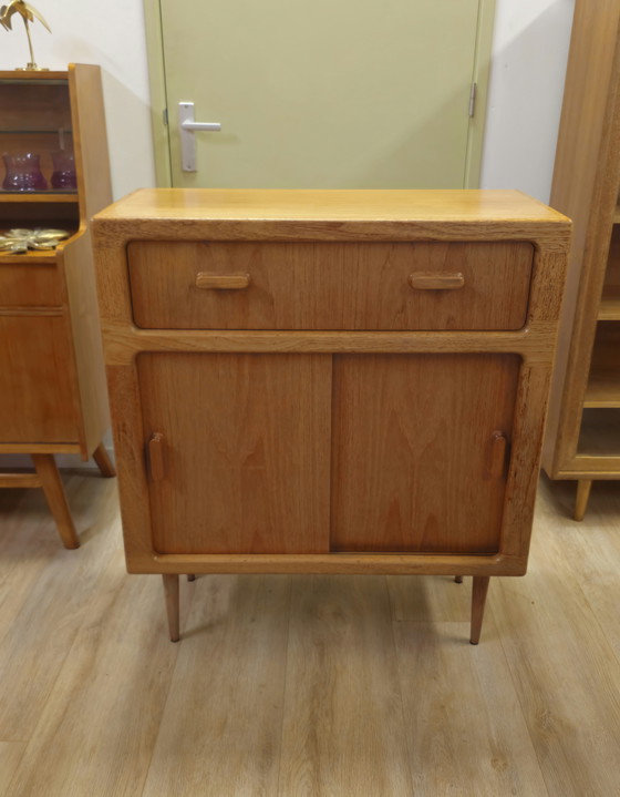 Bellissimo mobile danese del marchio di qualità Silkeborg. Il mobile è dotato di cassetti spaziosi e in parte di ante scorrevoli e ripiani. Splendidamente rifinito con belle giunture in legno, il mobile poggia su nuove gambe coniche.