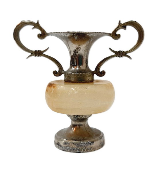 This exquisite vintage small decorative amphora is a testament to timeless elegance and craftsmanship. Its intricate metalwork, combined with a beautifully polished stone base, creates a striking visual appeal that is sure to enhance any space it graces.
