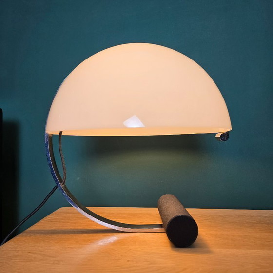 De lamp heeft een grote half-ronde kap van kunststof en een elegant metalen frame in zwart en chroom. De combinatie van rond en strak maakt dit een echte eyecatcher op een dressoir, bureau of side table. Perfect voor liefhebbers van Mid-Century Modern, Italian design en high-end vintage verlichting.