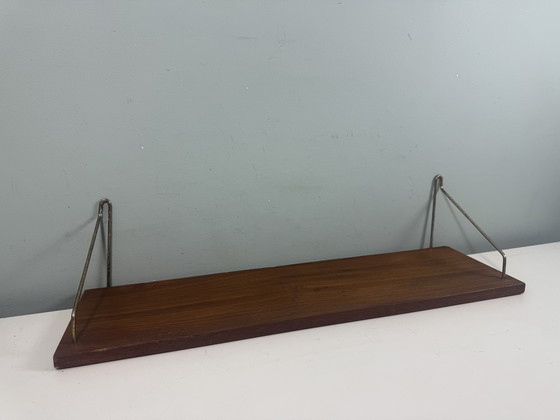 Questo scaffale da parete vintage in legno di teak incarna il classico stile Mid Century Modern, caratterizzato da un design elegante con staffe in metallo. Perfetta per aggiungere un tocco di eleganza rétro a qualsiasi ambiente, offre funzionalità e fascino estetico. Ideale per esporre libri, piante o oggetti decorativi, questa mensola è un'aggiunta versatile all'arredamento della vostra casa.