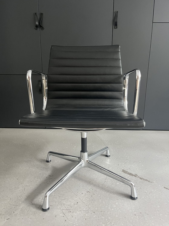 Questa sedia da ufficio in pelle Vitra Eames EA108 è un'aggiunta elegante e moderna a qualsiasi spazio di lavoro. Rivestita in pelle nera di alta qualità, offre comfort e stile. La sedia è dotata di una struttura in metallo lucido e di una base girevole che garantisce un'eccellente mobilità e supporto. Il suo design ergonomico garantisce un comfort duraturo, rendendola ideale per un uso prolungato in ufficio. Il design senza tempo della sedia e i materiali resistenti la rendono un pezzo pregiato per qualsiasi ambiente d'ufficio. La sedia è usata ma in buone condizioni.