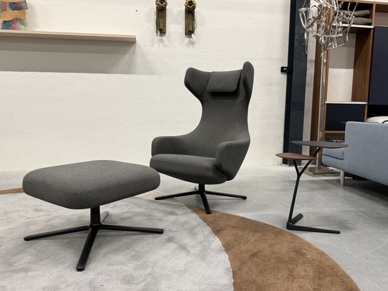Nuovo divano Vitra Grand Repos con pouf in tessuto Dumet grigio melange. Base scura di base. Prezzo al dettaglio € 6927. Dimensioni: 73 x P 81 x H 115 cm. ZH 41. Ora in vendita a € 4850, pouf incluso.