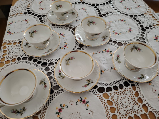 Il prezzo include 5 tazze e 5 piattini in ottime condizioni, usati. La sesta tazza e il piattino sono danneggiati; li includerò volentieri su richiesta.