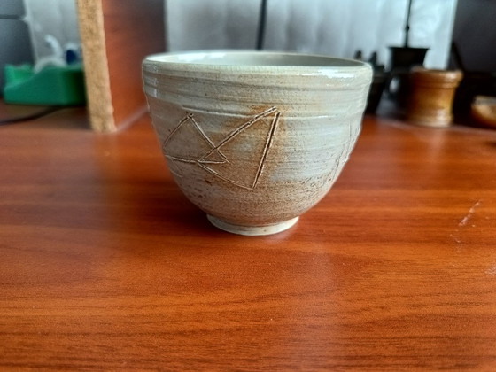 La tazza presenta una delicata smaltatura craquelé e un motivo a sgraffito inciso a mano nell'argilla. La parte inferiore è particolarmente pregiata, completamente smaltata e decorata con tre croci incise. L'altezza è di 7 cm.