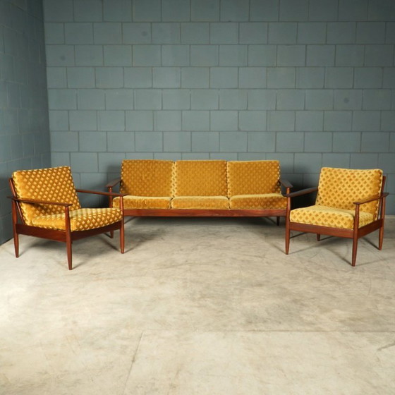 Questo fantastico e colorato set di sedute in teak proviene dalla Germania e risale agli anni '60/'70. Il set è composto da un divano a tre posti e due poltrone. Il designer e il produttore sono purtroppo sconosciuti, ma si tratta innegabilmente di un designer di talento! Che bel design e che qualità! Il set ha un delizioso look scandinavo, con le strutture in teak e i cuscini rivestiti in un bellissimo velluto giallo di alta qualità. Non solo ha una splendida fantasia, ma è anche incredibilmente pratico, poiché tutti i cuscini sono staccabili e sfoderabili. Il divano e le poltrone offrono un comfort di seduta eccellente. Un vero e proprio colpo d'occhio sia per la casa che per l'ufficio! L'intero set è in splendide condizioni vintage, con alcuni segni di usura sul legno. Il rivestimento è originale, ma in condizioni pari al nuovo, senza macchie o danni. Purtroppo, manca una stecca di legno dallo schienale centrale del divano, ma questo non è troppo evidente.