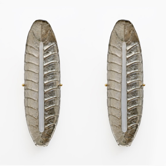 Bellissimo design per questa coppia di applique a forma di foglia, tutte argentate con una nervatura verticale bianca. I forni di Murano creano un design indiscutibile e senza tempo, semplice ma elegante allo stesso tempo. L'applicazione è realizzata da un unico pezzo di vetro di Murano, quasi come se fosse un Murano "sommerso". Ha la forma di una foglia molto ben scolpita, con una leggera nervatura orizzontale e una nervatura verticale bianca più spessa. Il suo colore è molto intenso e ricco, grazie al fatto che è colorata con una foglia argento sul retro. Tramite viti in ottone viene ancorata a una struttura in ottone che viene poi fissata a parete, la piastra di fissaggio comprensiva dei portalampada misura 10,5 cm di larghezza e 14 cm di altezza. Sono necessarie due lampadine G9. Molto grandi e accattivanti, queste applique faranno sicuramente bella figura in qualsiasi ambiente della vostra casa. Diverse coppie disponibili, chiedere la disponibilità.