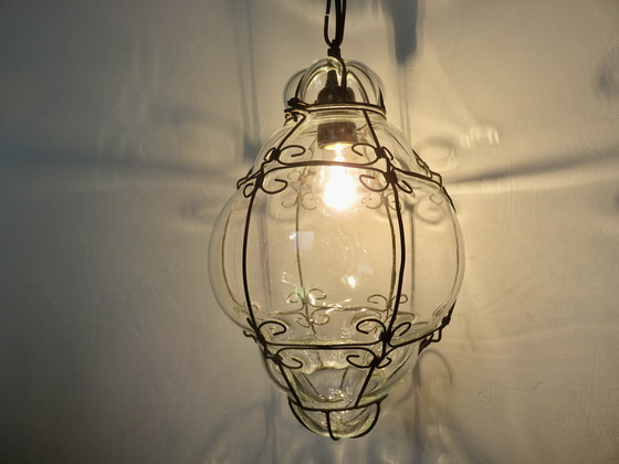 Lampada a sospensione in vetro soffiato a mano a forma di lanterna veneziana in una gabbia di metallo