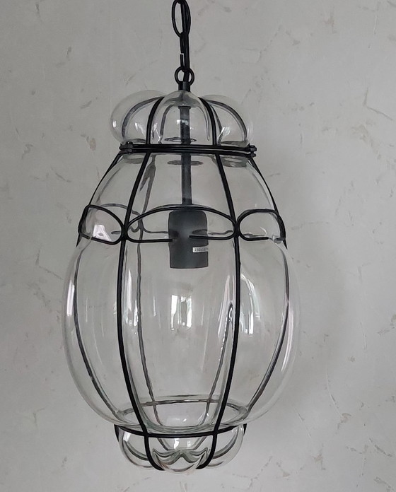 Questa lampada di metà secolo deriva dall'antica tecnica veneziana di soffiare il vetro in una cornice metallica in modo che il vetro fuoriesca dalla cornice. Questa tecnica è nota anche come vetro a gabbia. Questa lampada soffiata a bocca attira l'attenzione in qualsiasi stanza della casa. Anche all'esterno, sotto una tettoia o in una casa al mare, sarebbe un'ottima aggiunta. La lampada è in condizioni nuove. La struttura metallica non presenta ruggine. Il vetro non presenta graffi o imperfezioni. La lampada è appesa a una catena di metallo che consente di regolarne facilmente la lunghezza. Attacco E14 Altezza 36 centimetri Larghezza 23,5 centimetri Circonferenza 75 centimetri Catena 42 centimetri - con tappo a soffitto 56 centimetri