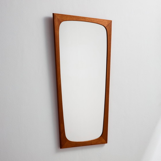 Specchio classico con cornice in teak degli anni Sessanta. La superficie dello specchio presenta alcuni graffi, ma è in buone condizioni vintage.
