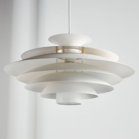Pendente in alluminio a sette lamelle 'Type 52580' degli anni '90 prodotto da Form-Light. Ideale per tavoli da pranzo o perfetta per l'illuminazione d'atmosfera. La lampada presenta graffi, macchie e usura in alcuni punti.