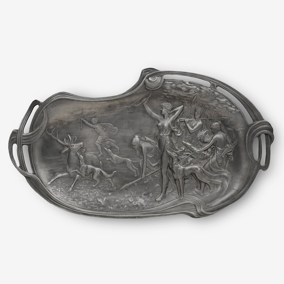 Francia / 1910 / Piatto / Latta / Art Nouveau / Art Déco Diana, Dea della Caccia Una ciotola in peltro martellato Art Nouveau con una scena splendidamente lavorata in rilievo, raffigurante Diana, la dea della caccia. Realizzata intorno al 1910 in Francia. Tipico dell'Art Nouveau è il design asimmetrico della ciotola e il famoso "colpo di frusta" che si può trovare lungo il bordo e nei manici. Un pezzo unico e molto decorativo. 24-0396