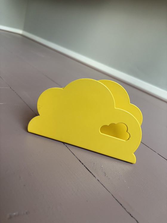 Simpatico portacarte o portatovaglioli in metallo giallo a forma di nuvola. Prodotto da Ikea, il design si chiama Rymlig.
