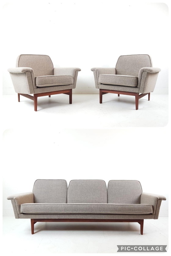 Set di divani vintage in legno di teak | divano + 2 poltrone in lana beige De Ploeg