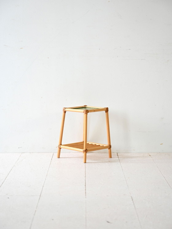 Elegante portavasi vintage in bambù con piano in vetro verde, ideale per piante o oggetti decorativi. Questo portavasi vintage in bambù presenta un design leggero ed essenziale, che lo rende un pezzo versatile e discreto. Il piano in vetro verde aggiunge un raffinato tocco di colore, mentre la struttura intrecciata ne esalta il fascino naturale. Buone condizioni. Potrebbe presentare segni del tempo. Si prega di prestare attenzione alle fotografie.