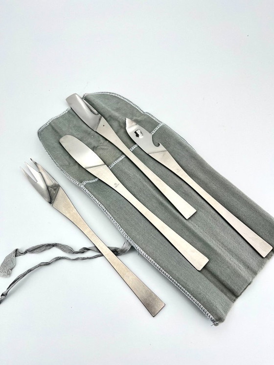 Include 4 utensili modernisti in acciaio inossidabile, in una custodia originale in tessuto.