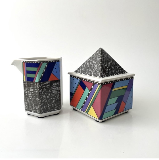 Questo set da latte e zucchero vintage Metropol di Rosenthal Barbara Brenner presenta un design moderno e sorprendente con vivaci motivi geometrici. Realizzato in porcellana di alta qualità, presenta una combinazione unica di elementi multicolori e neri. Perfetto per i collezionisti o per chi desidera aggiungere un tocco artistico alla propria collezione di stoviglie.