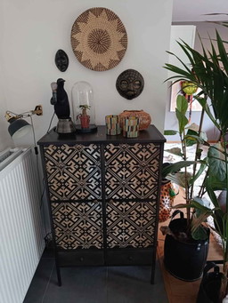 Bellissimo mobile in metallo nero con pannelli in legno sul davanti.Bellissimo mobile in metallo nero con pannelli in legno sul davanti.