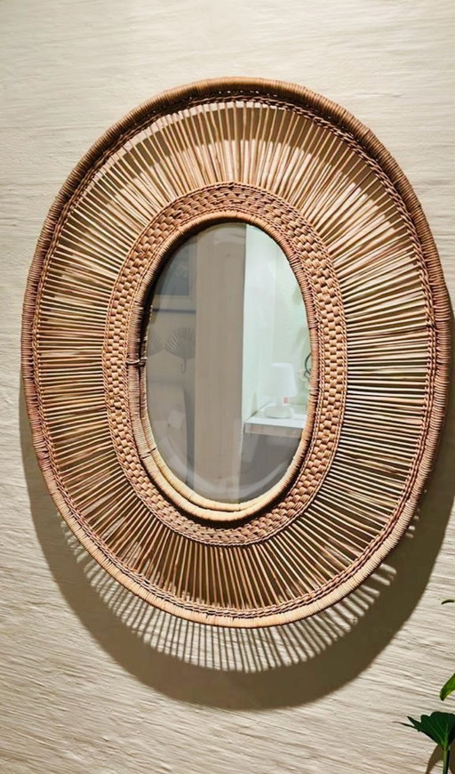 NUOVO specchio ovale in rattan fatto a mano di designNUOVO specchio ovale in rattan fatto a mano di design