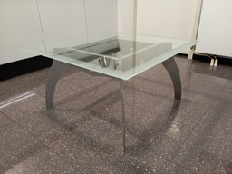 Tavolino angolare in vetro, 80 x 80 cm con bordo sabbiato.