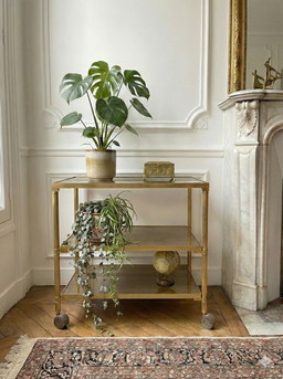 Carrello da portata vintage in ottone dorato e vetro su ruote, anni '60-'70