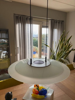Lampada a sospensione industriale in vetro opalino, anni '70