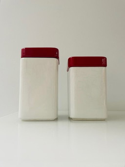 Vintage Red Kitchen Canisters for Tea, Sugar & Coffee – Dutch Retro Enamel Kitchen Storage Tins – Old European Kitchen Storage