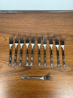 Set di 10+1 forchette da dessert giapponesi in acciaio inossidabile, motivo a rosa, 1970