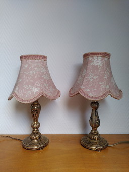 Duo of Salon Oil Lamps Early 20th Bronze Earthenware Copper Yellow Crystal