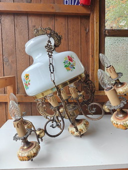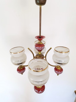 Vintage Chandelier, 4 Arm Brass Ceramic and Glass Ceiling Lamp, Vintage Light Fixture, 70s Pendant Light, Mid Century Modern Lam