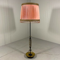 Rarity! Mid - Century floor lamp with pink velvet shade & fringes - brass base with marble decoration