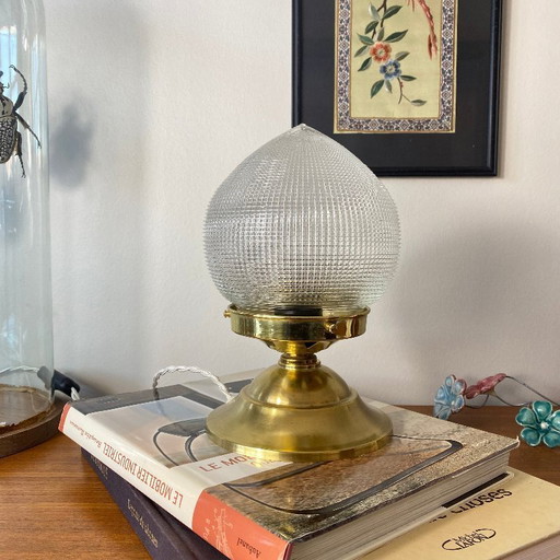 Antique globe table lamp in Holophane-type glass and brassAntique globe table lamp in Holophane-type glass and brass