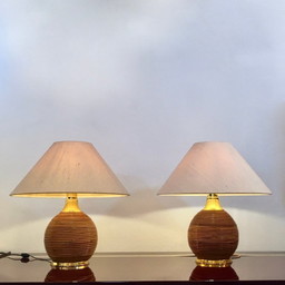 2x Brass & Rattan Table Lamps in the manner of Vivai del sud 1970s2x Brass & Rattan Table Lamps in the manner of Vivai del sud 1970s