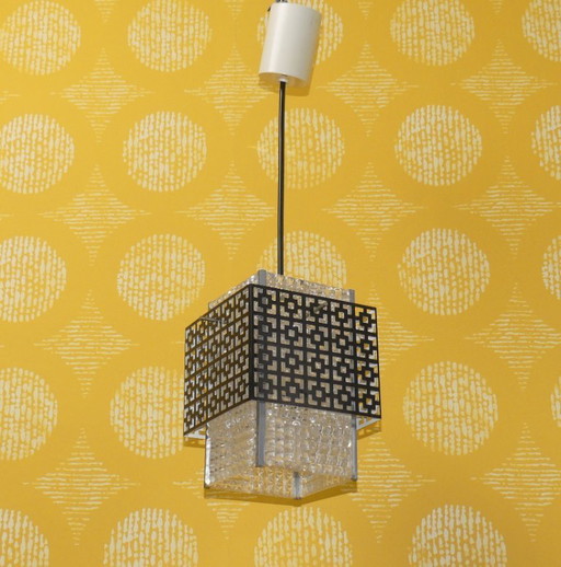 Vintage pendant lamp, chrome finish and glass lampshade, from the 1960s