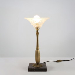 Art Nouveau Table Lamp with Brass and Marble Base and Glass Shade, 1920s
