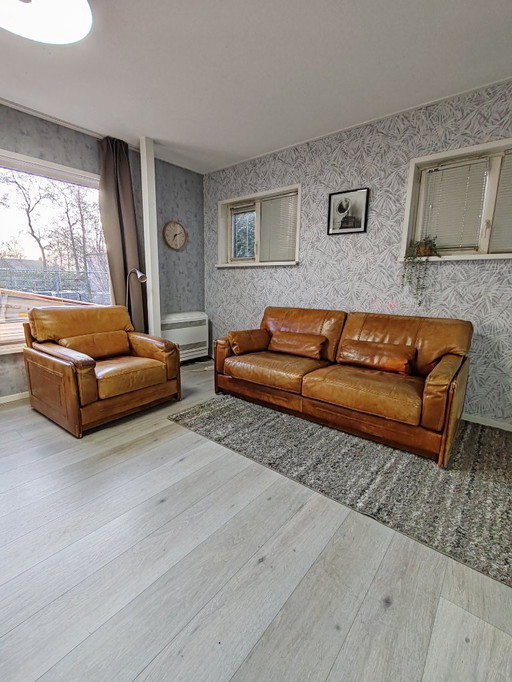 Leolux Joey set van salontafel, bijzettafel en leren poef.