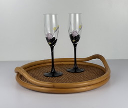 Vintage Rotan Geweven Rond Dienblad Met Bamboe Handvat En Houten Onderkant