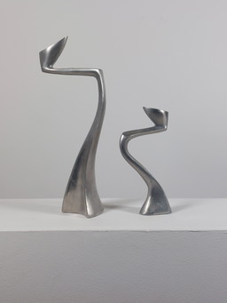 Een paar vintage aluminium kandelaars van Matthew Hilton.Een paar vintage aluminium kandelaars van Matthew Hilton.