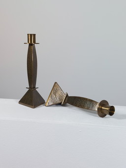 Een paar handgesmede, gehamerde messing kandelaars in Menphis-stijl.