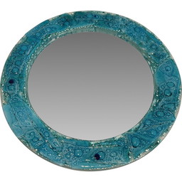 Ronde vintage spiegel in blauwachtig glasRonde vintage spiegel in blauwachtig glas