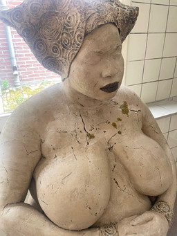 Mooi keramiek beeld van een zwangere vrouw. Kleur is bruin,creme. Kunstenaar is niet bekend,signatuur aanwezig