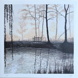 Aquarelprint van een Vlaams landschap, gesigneerd