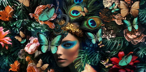 Glasschilderij vrouw met bloemen vlinders en pauwverenGlasschilderij vrouw met bloemen vlinders en pauwveren