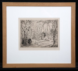 Ingelijste antieke ets met woonwagen ?Ed vd Meulen? ’19?