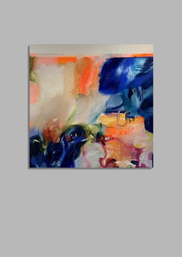 Abstract schilderij in rood, oranje en blauw, origineel schilderij op gespannen canvas.