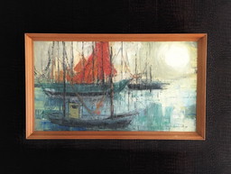 Origineel gesigneerd kunstschilderij "Marina" Bootscène uit de jaren 60 in BelgiëOrigineel gesigneerd kunstschilderij "Marina" Bootscène uit de jaren 60 in België