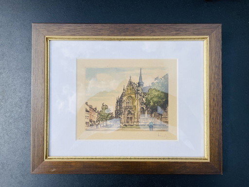 Aquarel van Hervé Lemiez, " Kerk van de Grote Zavel ". XXe eeuw