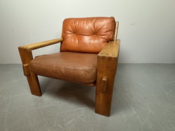 Mid-Century Brutalist Esko Pajamies Design 'Bonanza' Cognac Leather Lounge Chair on Solid Wooden Frame, Finland 1960s.