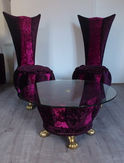 Salontafel en 2 bijbehorende troonstoelen in paars en fuchsia fluweel BRETZ
