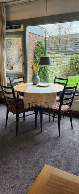 Pastoe mid century eettafel, vier stoelen, salontafel